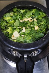 - In the pressure cooker add all the chopped greens, green chilies ,turnip and half quantity of chopped ginger along with 1 cup of water.