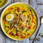 The Khao Suey also called Khow Suey, is a creamy, aromatic Burmese curried noodle soup. It is a one pot one meal comfort food. This dish takes me back to my childhood and to a time when my mother had joined a cooking class hosted by Mrs Alim, a well know culinary expert in the Kolkata of the those days. One of the dishes she learnt at Mrs Alim’s class was the Khao Suey and we all loved it so much that it became a frequent dish at home. My recipe is pretty much a lift and shift from my mother’s Khao Suey recipe. As for me, despite being a complex dish to make, I love it’s unique aroma and combination of ingredients (noodles, herbs, coconut broth, vegetables/chicken and condiments that goes as toppings). This dish takes time and patience tomprepare. So I would suggest that you prepare the stock and the curry paste one day in advance. This helps the final preparation and serving expeditious. The Khao Suey is an all season dish and one can have it for Lunch or dinner. So if you get your hang of this dish, it will be a great addition to your culinary repertoire. It is well worth the effort you put in to cooking this delectable dish.